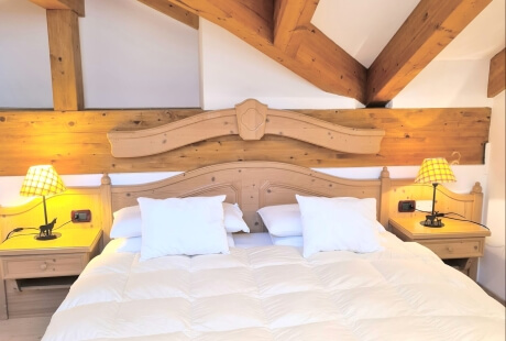 Ampia family suite di 40 mq, 2 ambienti comunicanti (appartamento su 2 piani con scala in legno), con balcone vista montagne e giardino.