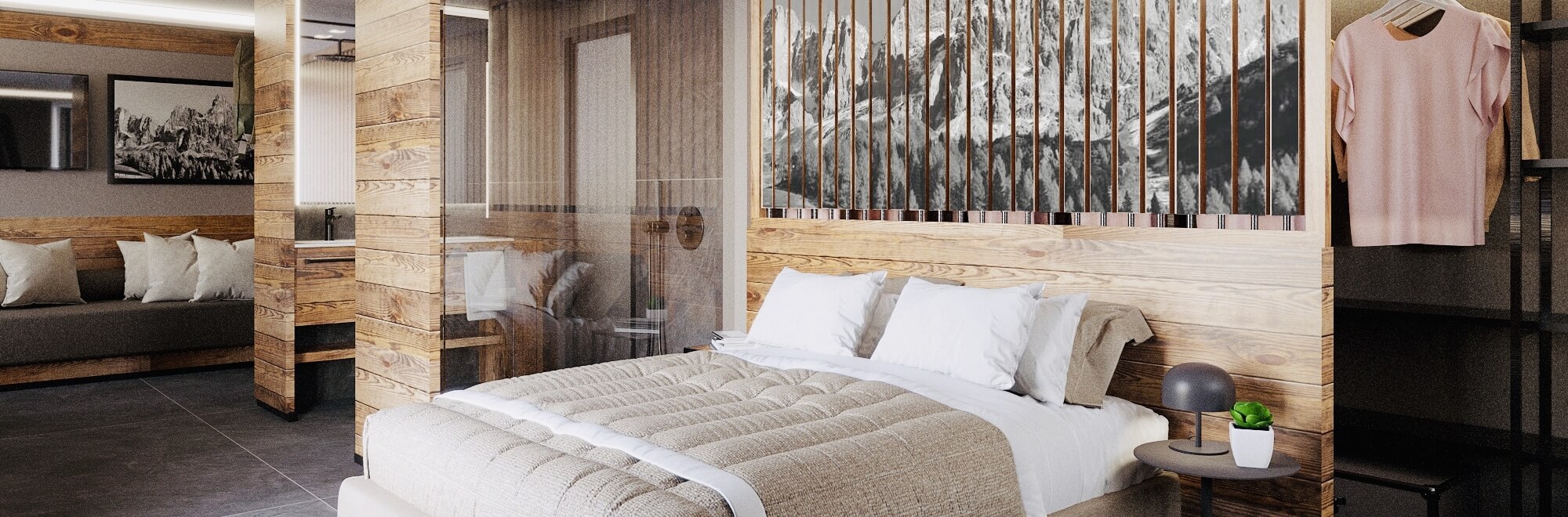 Ampia family suite con cabina armadio e balcone vista montagne e giardino.